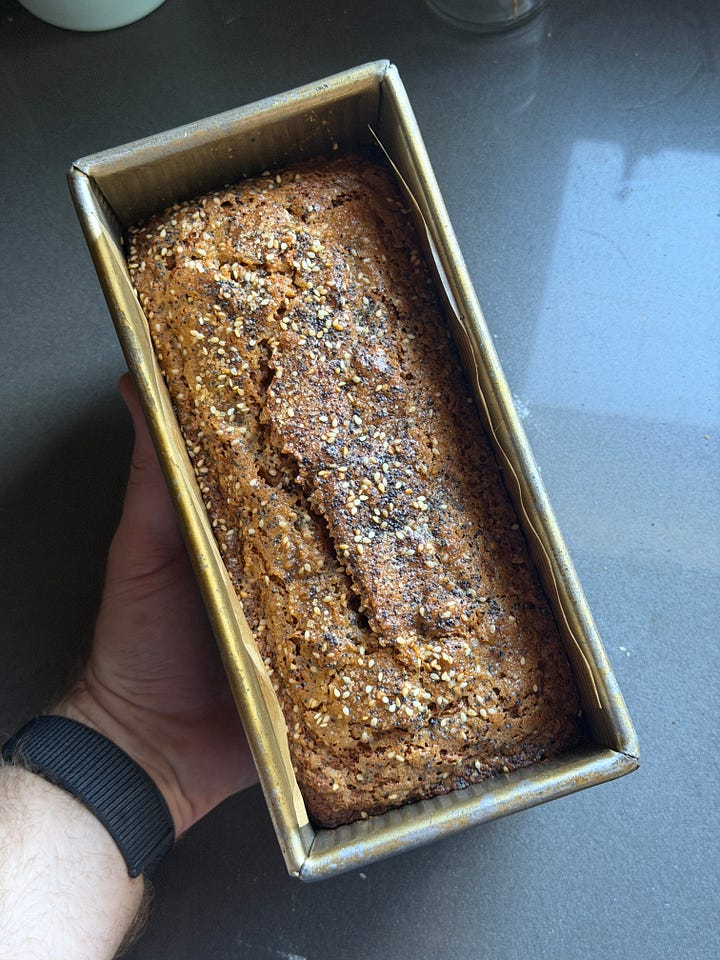 I finally made your banana bread this afternoon and we are having it for our dessert tonight. I only changed out the pecans for walnuts, on hand, and had to skip coconut, which I forgot to pick up. That wasn’t going to stop me, and I baked it for exactly 60 minutes and I wanted to thank you for sharing this recipe, with a twist on some ingredients, grated ginger, and the topping with the seeds. Love it, and will make it again and again!